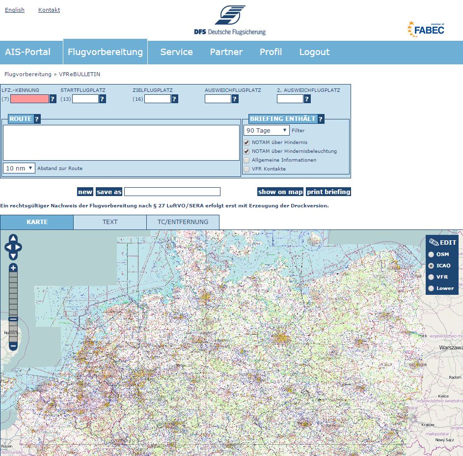 Für alle die ausführlichere Informationen suchen möchte ich hier kurz aufzeigen wie man als kostenlos registrierter Nutzer auf der Website der DFS kostenlos die ICAO-Karte einsehen und sich für die geplante Route wichtige Notams anzeigen lassen kann: