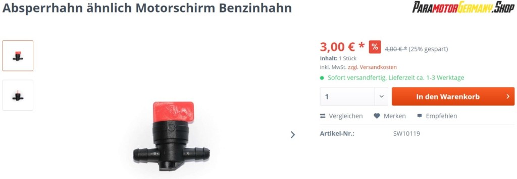 Damit beim Start nicht direkt Sprit durch die Belüftung bei ungeschickten Bewegungen nach außen läuft nutze ich einen Absperrhahn: